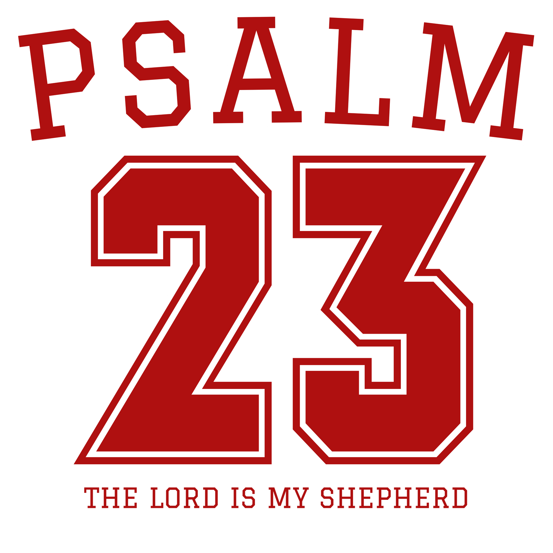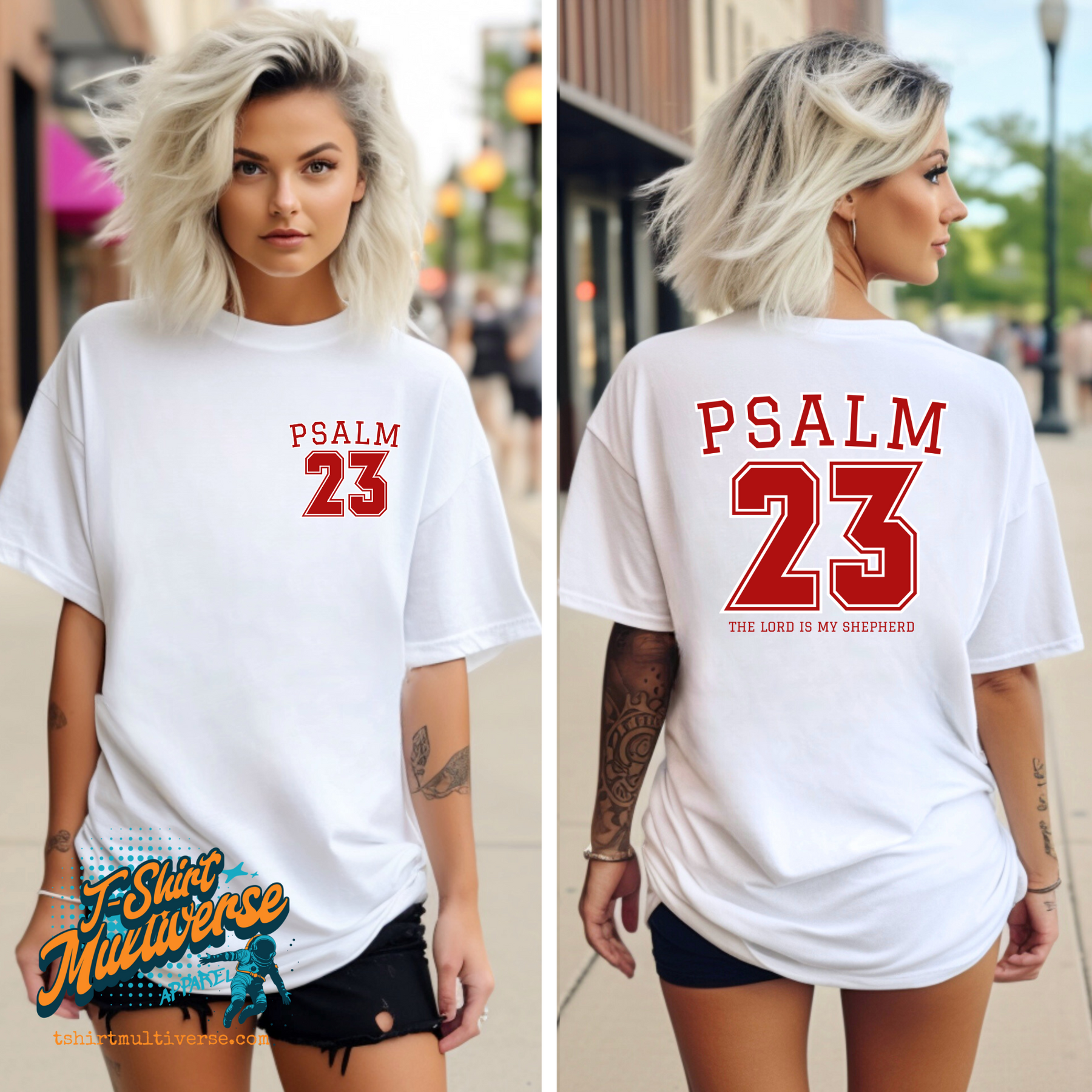 Comfort Colors Unisex T-Shirt in the color white with the design "Psalm 23" on front pocket of shirt and Psalm 23 - The Lord in my Shepherd wording on back of shirt.